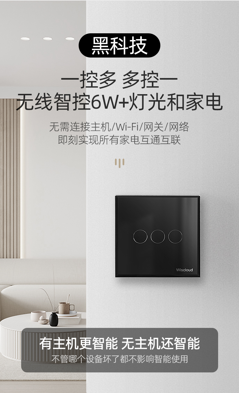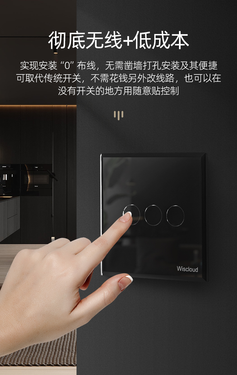 實現(xiàn)安裝“0”布線,無需鑿墻打孔安裝及其便捷可取代傳統(tǒng)開關(guān),不需花錢另外改線路,也可以在沒有開關(guān)的地方用隨意貼控制