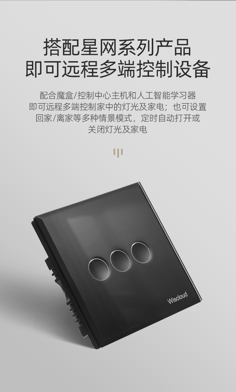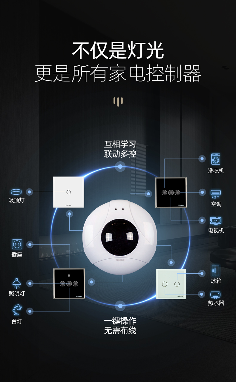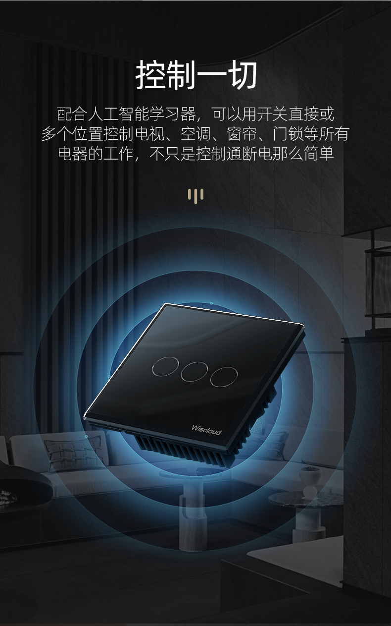 配合人工智能學習器,可以用開關(guān)直接或多個位置控制電視、空調(diào)、窗簾、門鎖等所有電器的工作,不只是控制通斷電那么簡單