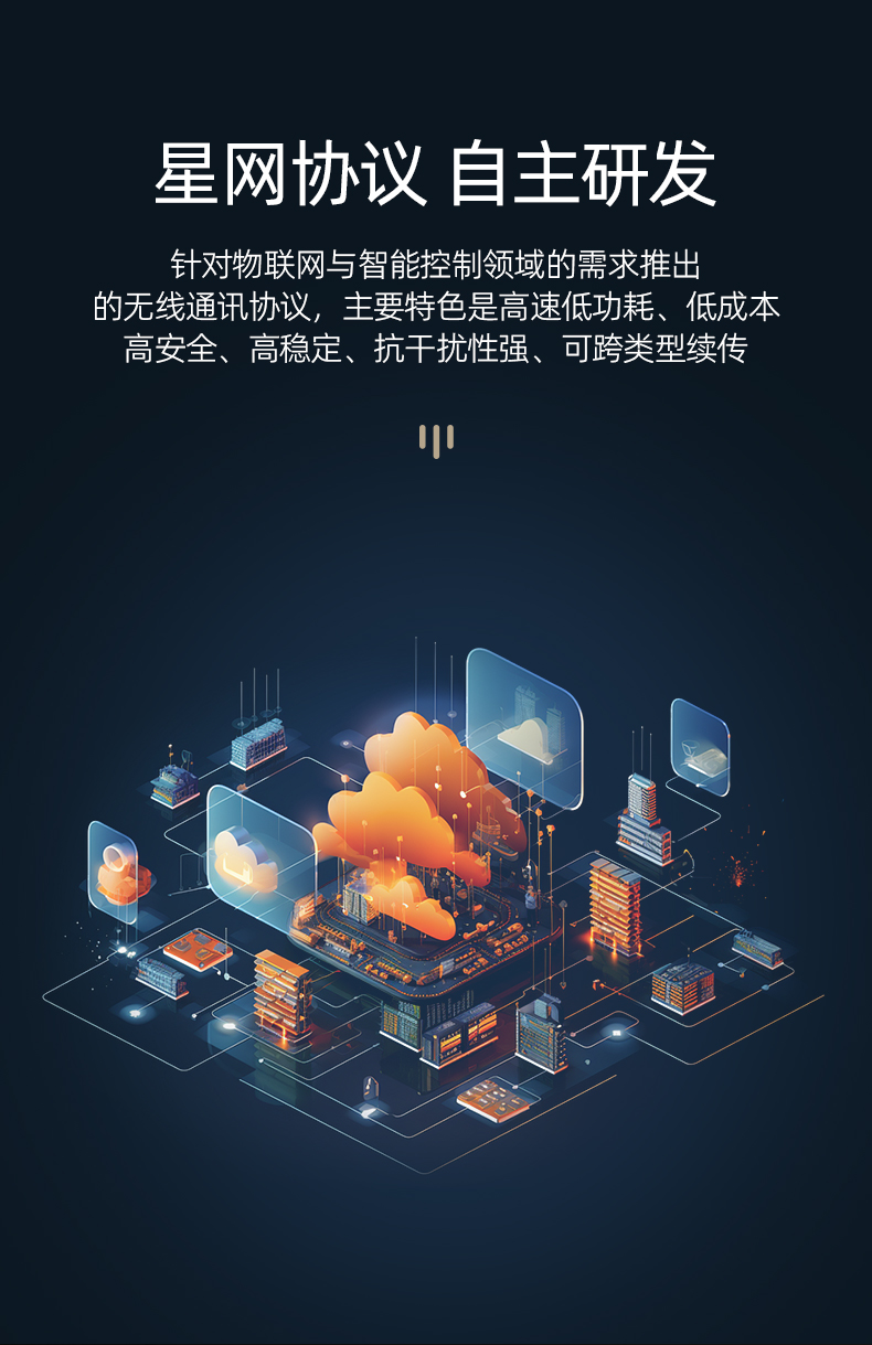 針對物聯(lián)網(wǎng)與智能控制領(lǐng)域的需求推出的無線通訊協(xié)議,主要特色是高速低功耗、低成本高安全、高穩(wěn)定、抗干擾性強、可跨類型續(xù)傳