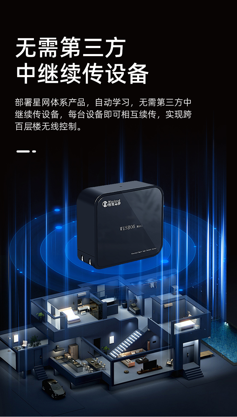 部署星云體系產品,自動學習,無需第三方中繼續傳設備,每臺設備即可相互續傳,實現跨百層樓無線控制。