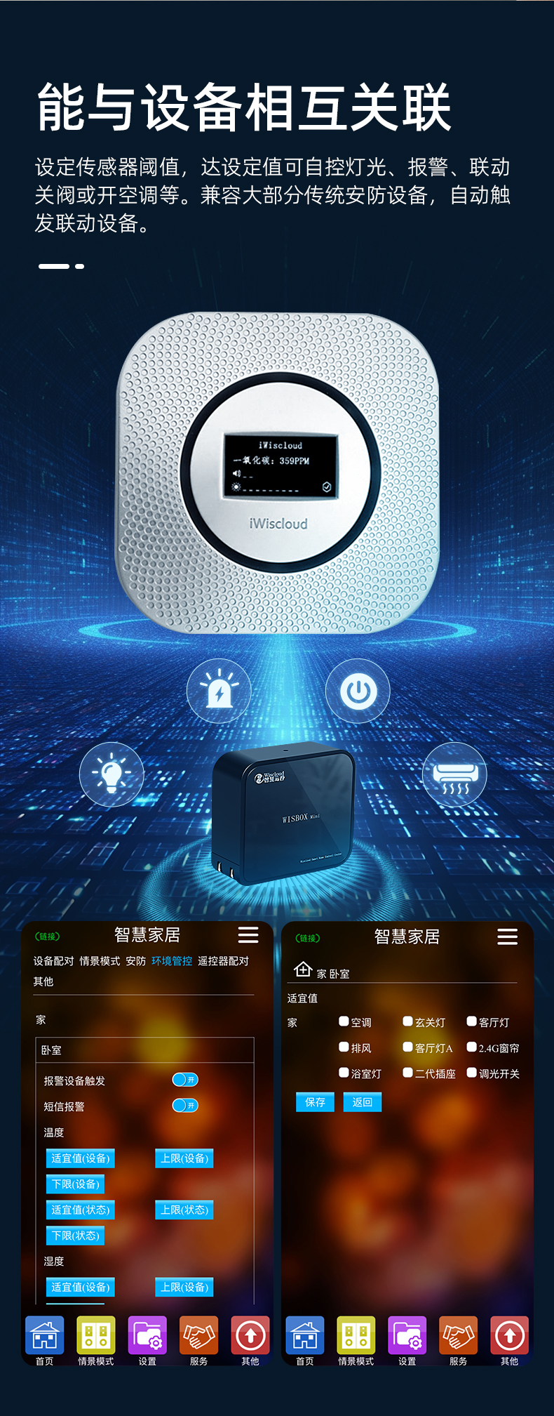 設定傳感器閾值,達設定值可自控燈光、報警、聯動關閥或開空調等。兼容大部分傳統安防設備,自動觸發聯動設備。