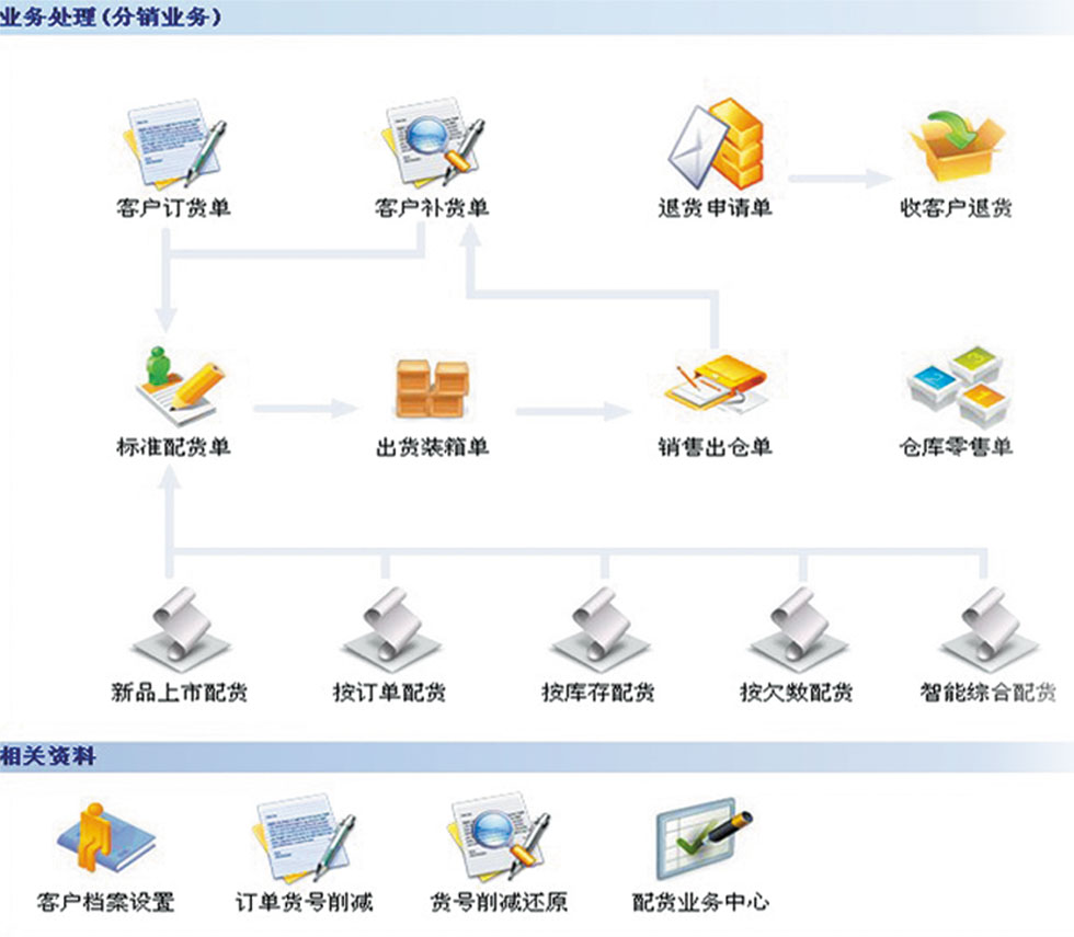 初期建賬、進貨管理、銷售管理、庫存管理、錢流管理、統計報表、系統管理、其他功能