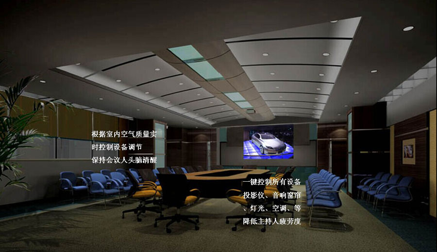 通過演講臺上的Wiscloud控制中心或者用手機在來會議室的路上遠程一鍵“會議模式”,會議室內的燈逐一亮起,窗簾緩緩拉開,背景音響系統打開、空調、加濕器、加氧機等根據空氣質量傳感器監測數據啟動。