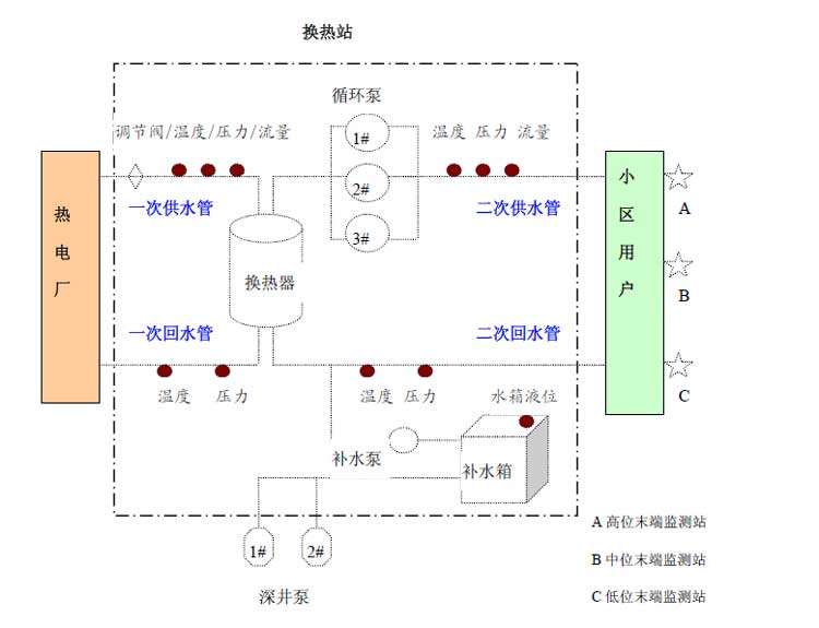 (2)實現對換熱站設備運行情況、相關運行參數的實時監控,以及重要管網測點溫度、壓力數據的在線監測。