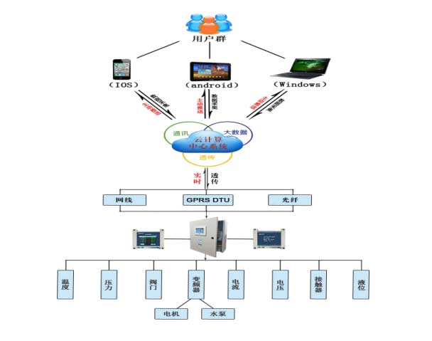 輸到云端進入到有固定IP地址的服務器里,把現場供熱站的各類數據進行采集進入云計算中心,熱力公司的工作人員通過客戶計算機訪問云計算中心服務器數據,實時了解各監測站點的設備運行情況、相關運行參數。監控中心發送的命令也由此路徑執行到受控設備。