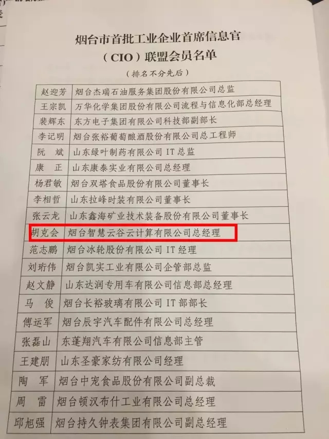煙臺市工業企業首席信息官(CIO)聯盟是市經信委為貫徹落實工信部《企業首席信息官制度建設指南》和《山東省信息化和工業化深度融合專項行動方案(2014-2018)年》等文件精神,進一步推進煙臺市信息化與工業化深度融合,推動企業管理模式和業務模式的變革與創新,擬成立的旨在推動全市企業首席信息官之間交流合作的開放式、非營利的組織。經過半個月的遴選,煙臺星云天啟云計算有限公司和CEO、CTO胡克會成功入選!