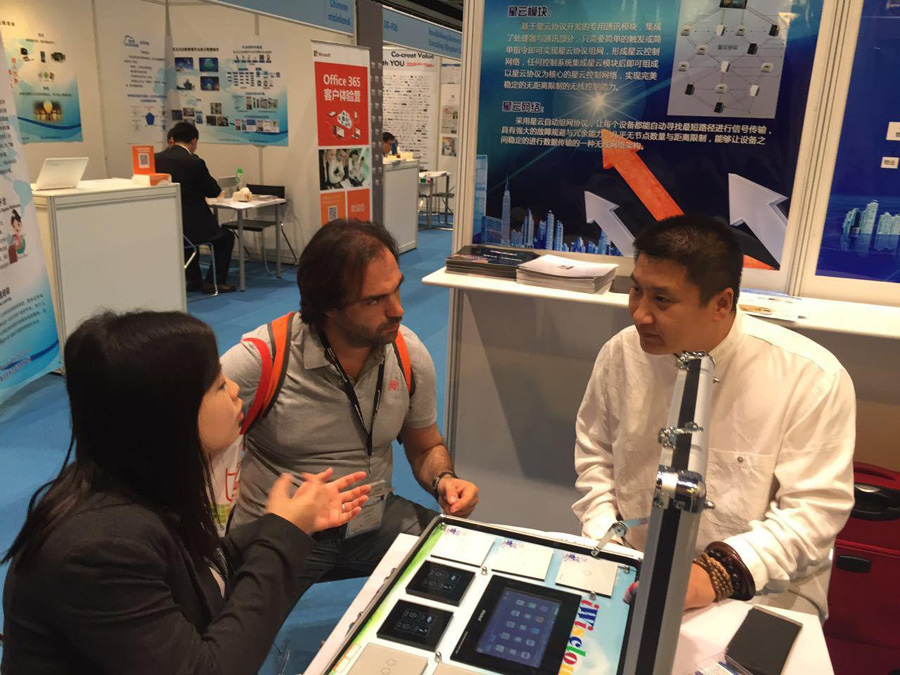 展會第二天依然盛況空前,星云天啟在技術上引領整個智慧家居行業的潮流和發展,在云計算方面更是爐火純青。此次展會,“云”是一大熱點,作為全球話題和投資熱點,“云”高效、靈活、低成本、低功耗等優勢極為受重視和青睞,星云天啟基于云計算核心的智慧家居和工業自動化控制系統兩大核心產品吸引了不少的參展商前來參觀、洽談與合作,并且此次展會為我們提供了一個非常好的平臺,我們非常希望能夠在這樣的平臺上與國際合作伙伴及客戶有良好的互通,也愿意把我們的成功經驗毫無保留地分享出來。