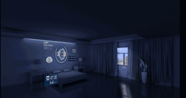 系統檢測到人體蘇醒,將緩緩開啟起夜燈,若主人下床上廁所,走廊燈、廁燈也會依次開啟,暫時關閉安防模式,以免造成驚擾,主人回到床上,燈光再次關閉,安防模式恢復開啟狀態。