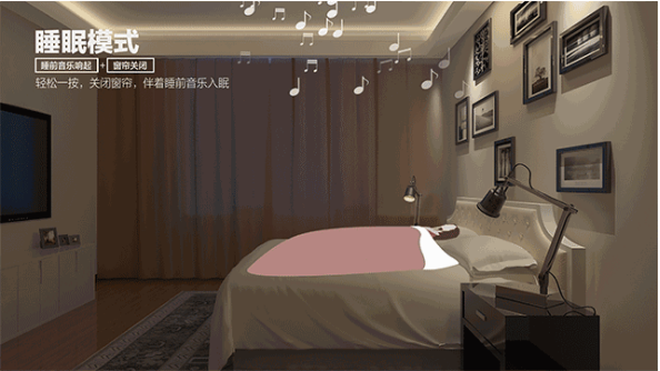 一鍵進入睡眠模式,燈光亮度緩緩調暗,窗簾自動合上,戶外安防系統啟動,睡眠后系統自動調整空調溫度,避免受涼。