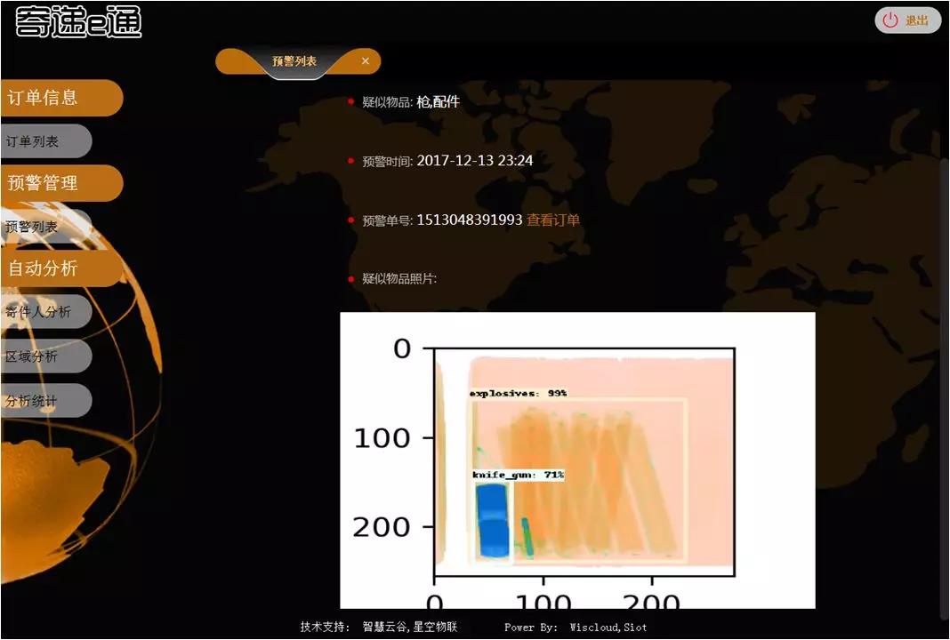 人工智能寄遞物流管控系統通過一個二維碼集合了寄件人與貨物的信息,整合到大數據端,通過X光機掃描和圖像識別可將識別的貨物與二維碼信息比對,同時自動識別違禁品,有效減少人工遺漏,危爆物品智能檢測系統能夠發現難以察覺的危爆物品,通過后臺大數據自動研判找出重點人員及流向重點區域的貨物。
