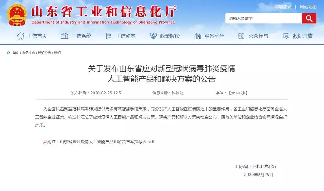 為全面抗擊新型冠狀病毒肺炎提供更多有效智能手段支撐,充分發(fā)揮人工智能在疫情防控中的重要作用,山東省省工業(yè)和信息化廳面向全省人工智能企業(yè)征集、篩選并匯總了應(yīng)對(duì)疫情人工智能產(chǎn)品和解決方案。