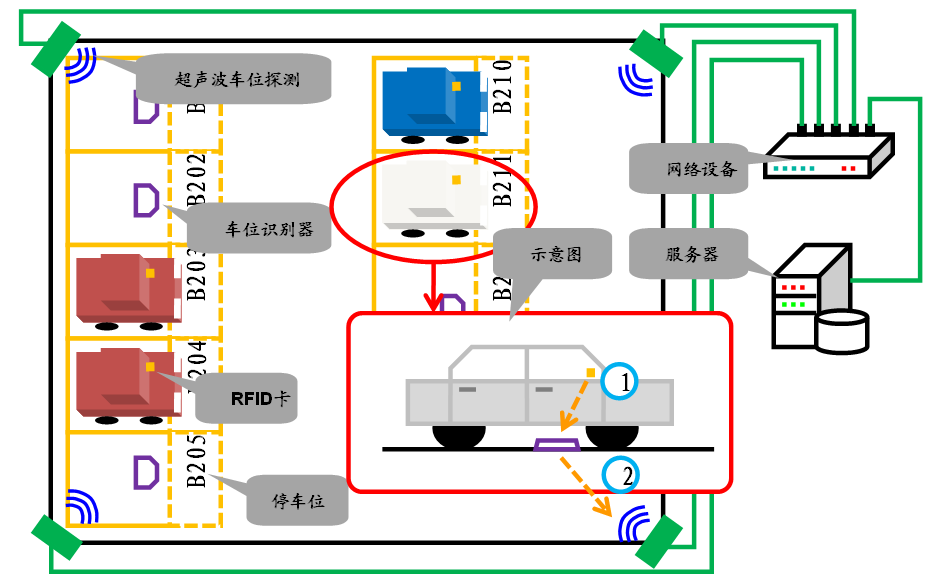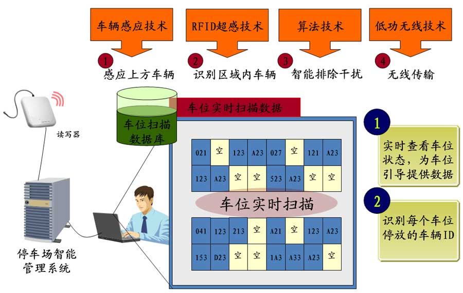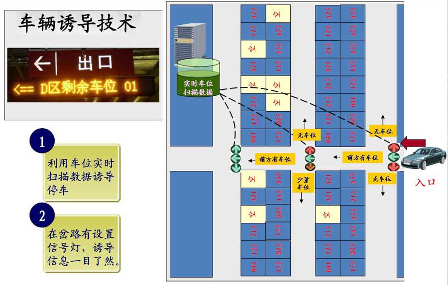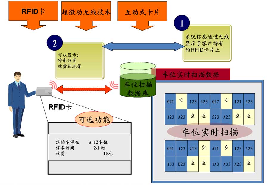 精確尋車技術是基于RFID無線識別技術的一種應用。當車輛停入車位時,安裝在每個車位上的“車位識別器”會獲取到車輛信息;然后“車位識別器”會將車位信息發送,這樣我們可以準確的知道車位狀況。