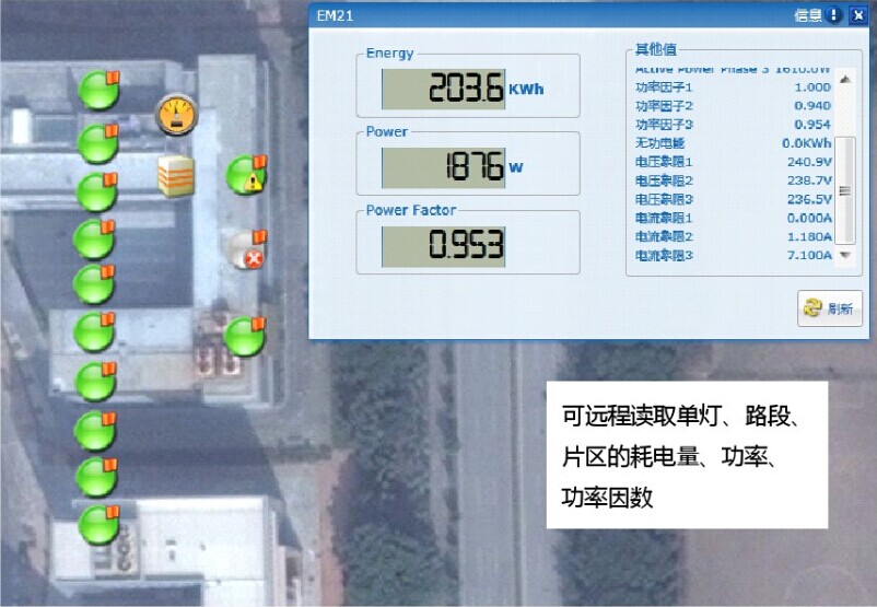遠程讀取單燈、路段、片區的耗電量、功率、亮度、運行時間等工作狀態,當某一處路燈故障時,系統自動顯示地理位置及故障信息,無需人工巡視,降低人員維護力度。
