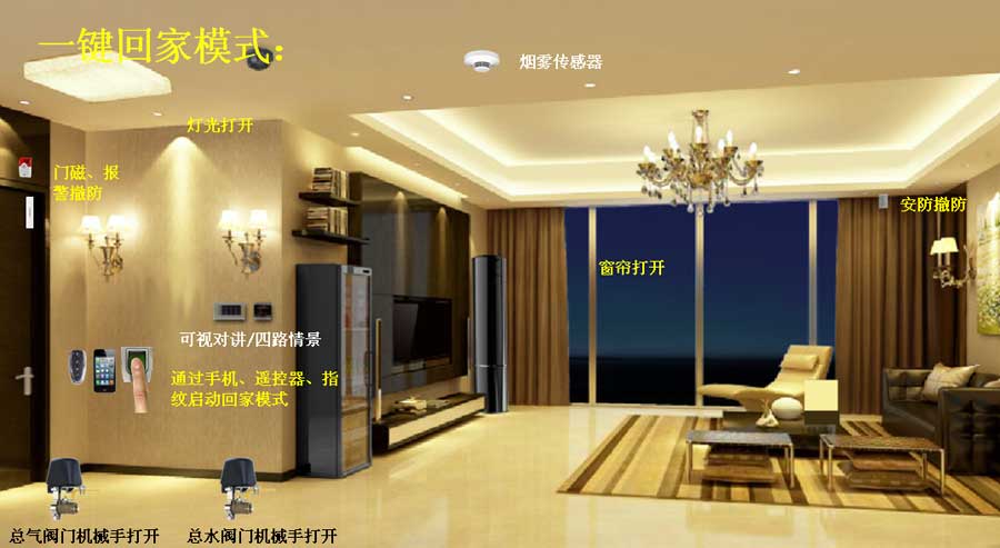 傍晚7:00回家,可以通過手機或者4鍵小遙控器或指紋一鍵“回家情景模式”。此時,家中的防盜報警撤防、門自動打開、門口燈、客廳燈依次打開、窗簾打開、飲水機開始工作、燃氣與水閥門同時打開,一切呈現出歡迎主人回家的情景。