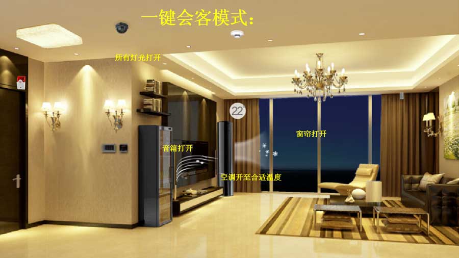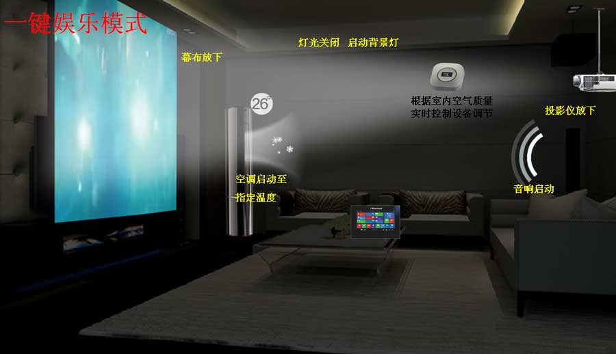 如觀看電影,一鍵“娛樂模式”,窗簾將緩緩拉上,關閉燈光,打開燈帶(背景光)電視關閉、幕布和投影儀緩緩降下、音箱等也將啟動,告別了一大堆遙控器的繁瑣步驟。空調、加濕器、干燥機等受溫濕度傳感器、甲醛傳感器、一氧化碳、二氧化碳、氧氣等一系列傳感器根據需要實時自動控制。