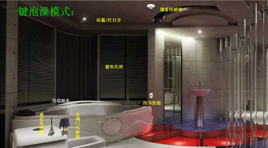 一鍵“沐浴模式”浴缸自動加水至設置位置,窗簾關閉、濕度傳感器和氧氣傳感器會根據房間內的氧氣含量和濕度控制換風系統,從而,避免了因為泡澡濕度過大缺氧的現象,同時浴缸旁邊設置緊急按鈕方便呼叫求助。