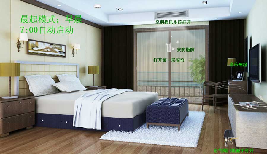 可設置為自動啟動“晨起模式”,早上7:00窗簾緩緩打開,引水機水已經燒開,背景音樂或電視機緩緩響起音樂,空調等換風系統工作,燃氣閥門打開,同時門磁、窗磁撤防。