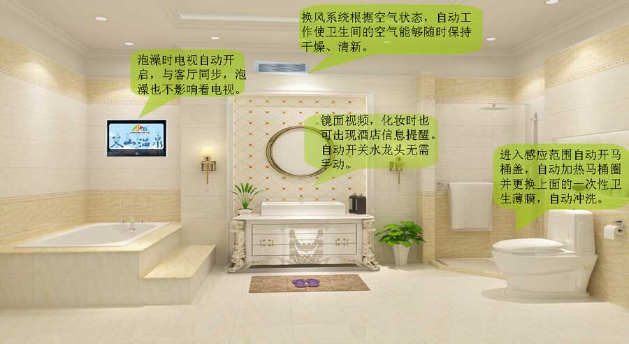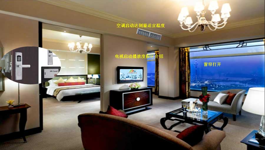 房間FRID讀卡器感應到本房房客的到來,自動打開門鎖,在門口插卡取電后,門口的人體感應燈、窗簾、電視自動打開并播放酒店介紹錄像、空調自動啟動并調節到適應溫度。