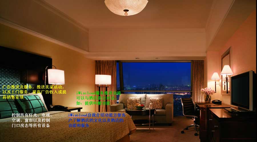 叫醒功能:如提醒管理中心早上6點叫醒起床,管理中心就設定6:00控制某個房間啟動起床模式,如:早上6:00執行某房間的起床模式,叫醒音樂緩緩響起,窗簾緩緩拉開,客人在輕松愉悅的音樂中醒來。
