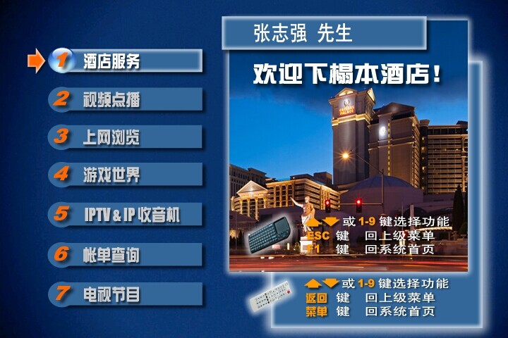 網絡電視點播,電視顯示歡迎詞和功能菜單,使客人有賓至如歸的感覺。