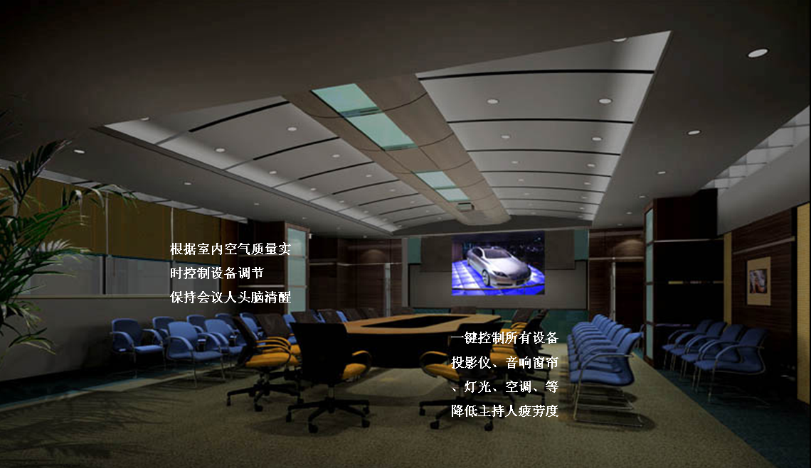 14:00會議室領導開會,觸摸“會議模式”燈逐一亮起,窗簾拉開,背景音響系統打開,空調、加濕器、加氧機等根據空氣監測數據啟動